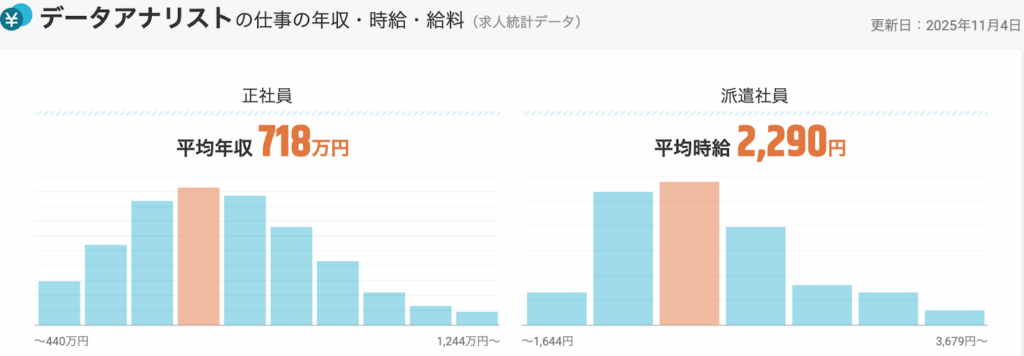 そんなデータアナリストの平均年収は、718万円(2025年11月時点)です。