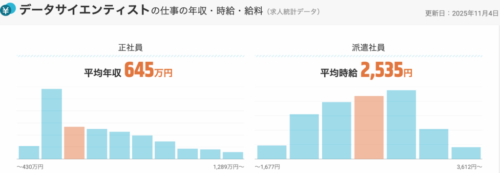 そんなデータサイエンティストの平均年収は、約645万円(2025年11月時点)です。