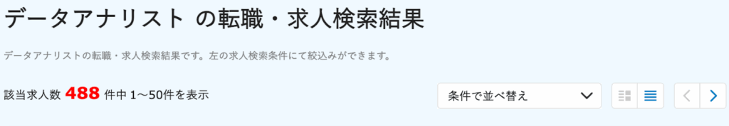 求人はデータサイエンティストと比較して少ないですが、dodaだけで500件近く掲載されています。(2025年11月時点)
