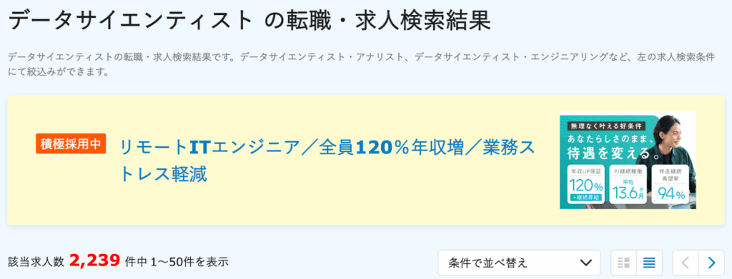 また、データサイエンティストの需要は、近年増していくばかりで、求人情報も豊富です。(2025年11月時点)