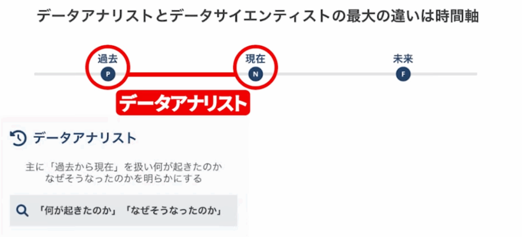 データアナリストは主に、過去から現在を扱います。「なぜ起きたのか」「なぜそうなったのか」を明らかにする仕事です。