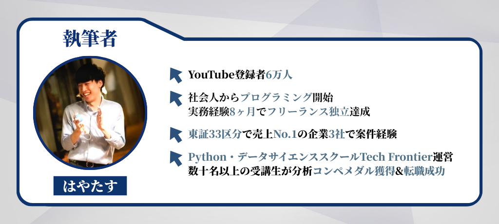 現役データサイエンティストで、240人を超えるデータサイエンススクールを運営するはやたすが、わかりやすく説明します。